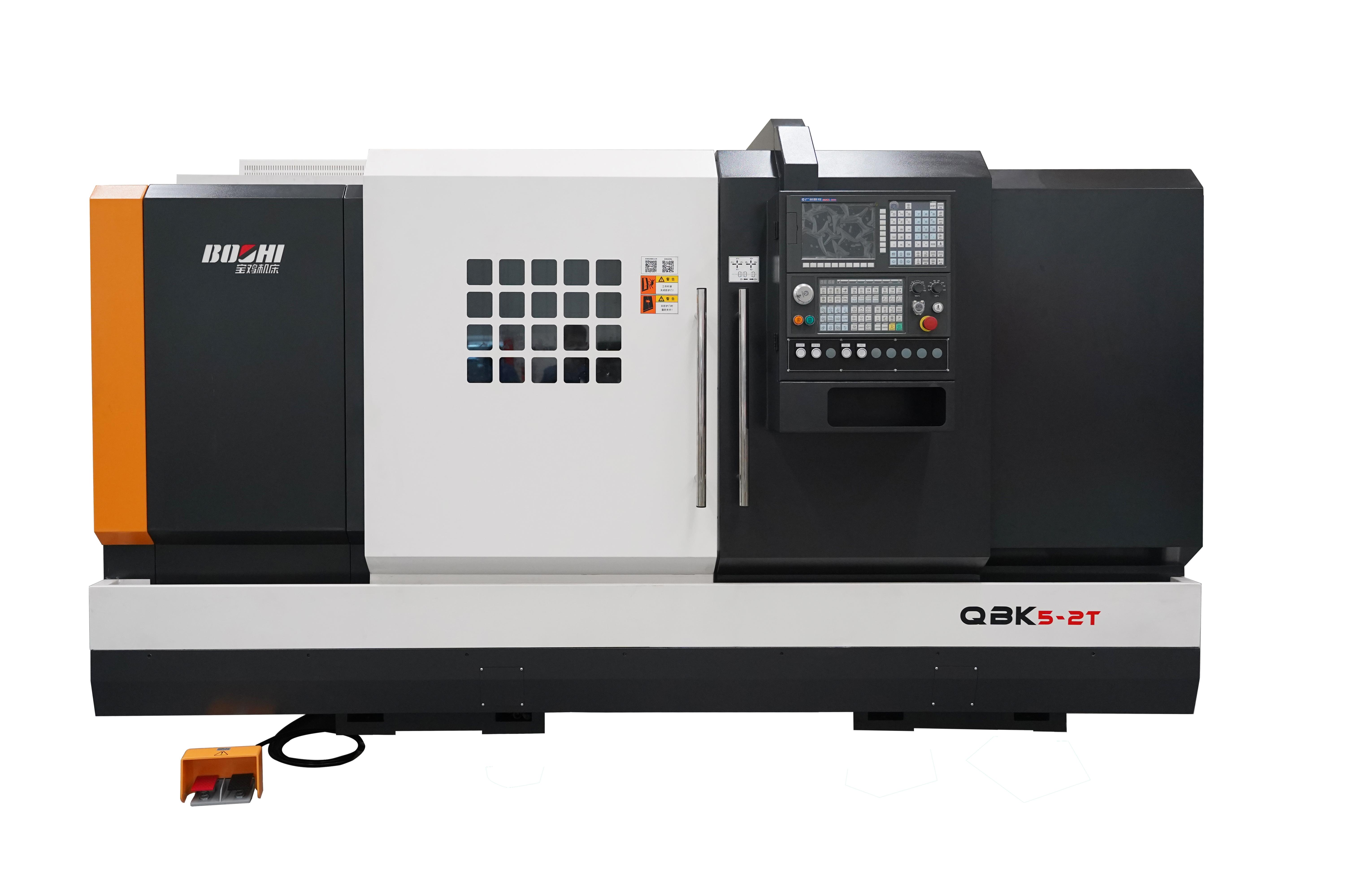 QBK5-2T數(shù)控車床是針對(duì)風(fēng)電領(lǐng)域所用緊固螺栓加工而開發(fā)的一款中間驅(qū)動(dòng)數(shù)控車床,該車床采用兩個(gè)單側(cè)液壓驅(qū)動(dòng)筒夾夾持工件中部,左右兩側(cè)各配置一組排式刀架,通過兩側(cè)刀具同時(shí)車削,實(shí)現(xiàn)對(duì)工件的一次裝夾,完成兩端外圓、端面的高效加工。為適用不同長度工件加工需求,兩側(cè)夾頭間距可通過程序控制實(shí)現(xiàn)自動(dòng)調(diào)整,方便快捷。